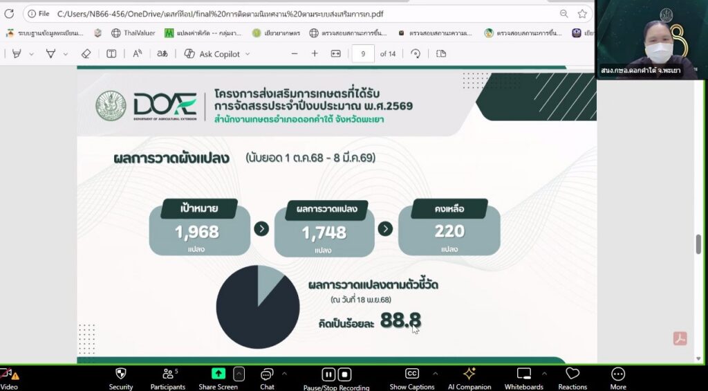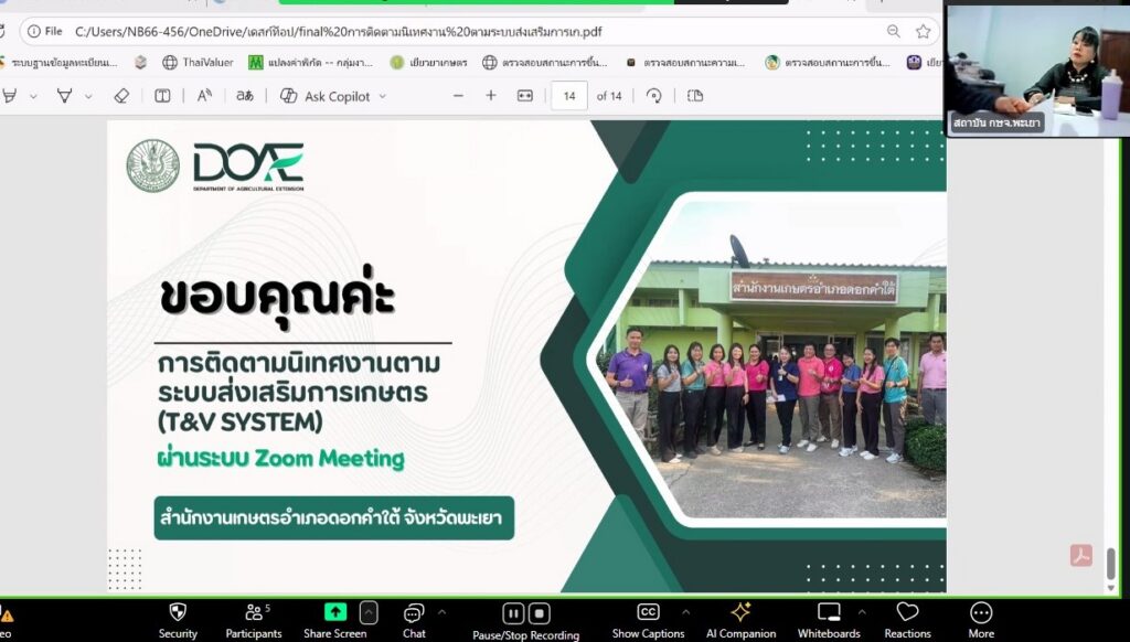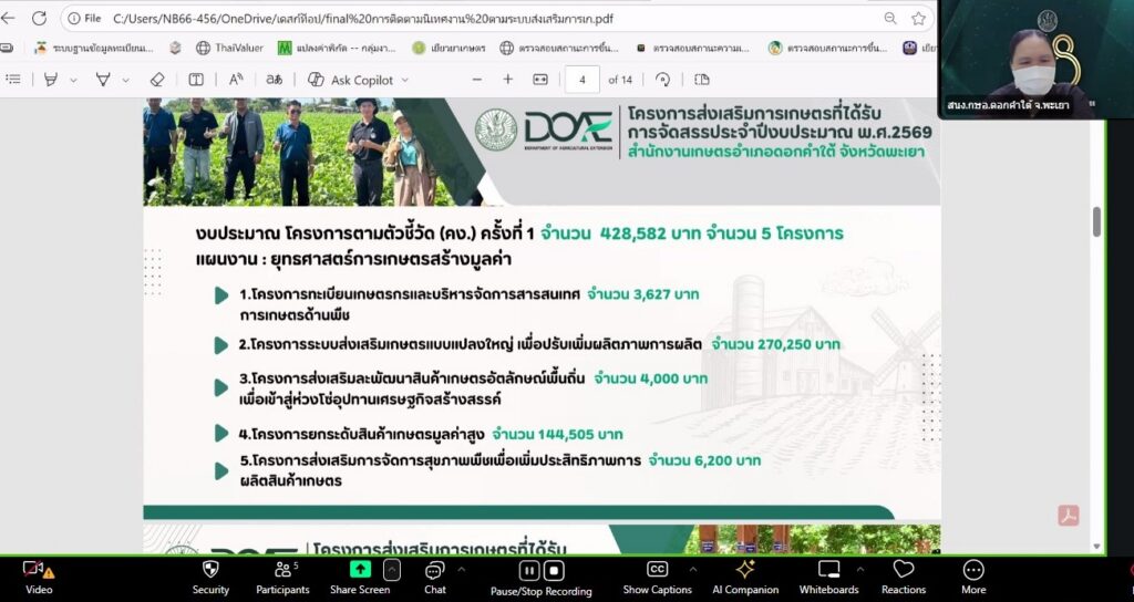 มอบหมายให้ นางสาวธัญญ์รวี ธนศิริพูลภัทร์ หน้ากรมส่งเสริมและพัฒนาเกษตรกร พร้อมด้วยเจ้าหน้าที่นักงานเกษตรจังหวัดพะเยา ทีมที่ 3 ดำเนินการนิเทศงานตามระบบส่งเสริมการเกษตร (T&V System) ผ่านระบบ Zoom Meeting ปีงบประมาณ พ.ศ. 2569 ครั้งที่ 1
